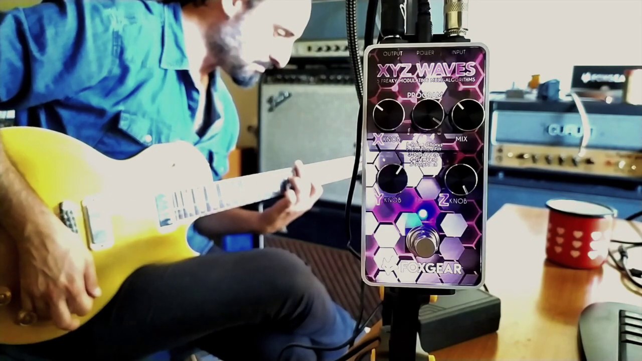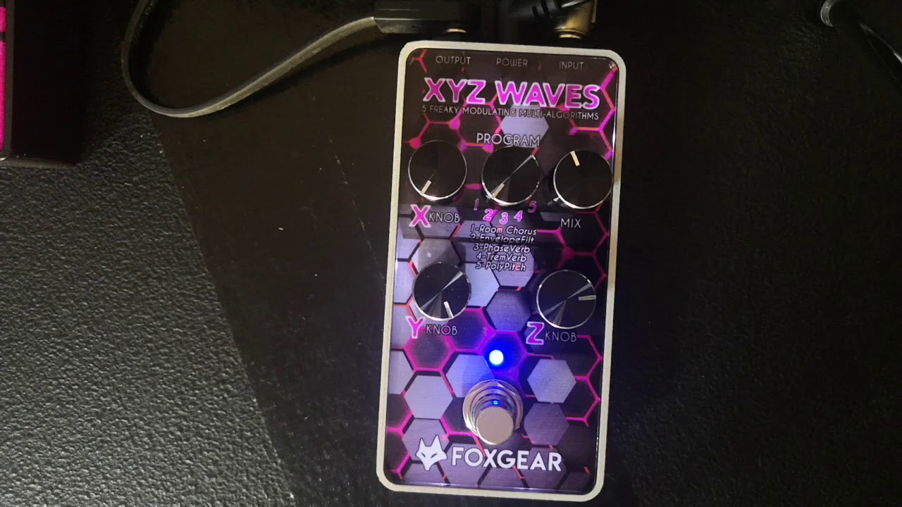 Après avoir bouleversé le marché de la réverbe numérique avec sa Rainbow, Foxgear remet le couvert et s’attaque aux effets de modulation avec la XYZ. Waves. Elle propose cinq effets de modulation auxquels on accède par l’intermédiaire d’un potard central cranté. On dispose également d’un réglage Mix qui effectue la balance entre les signaux avec et sans effet. La XYZ Waves dispose ensuite de trois réglages, XYZ, dont les fonctions changent selon l’effet sélectionné. Les algorithmes de chorus, phaser et trémolo sont accompagnés d’une réverbe dont le niveau est contrôlé par le réglage X. Les cinq algorithmes de modulation sont les suivants : Room Chorus, Enveloppe Filter, Phase Verb, Trem Verb et Poly Pitch.
