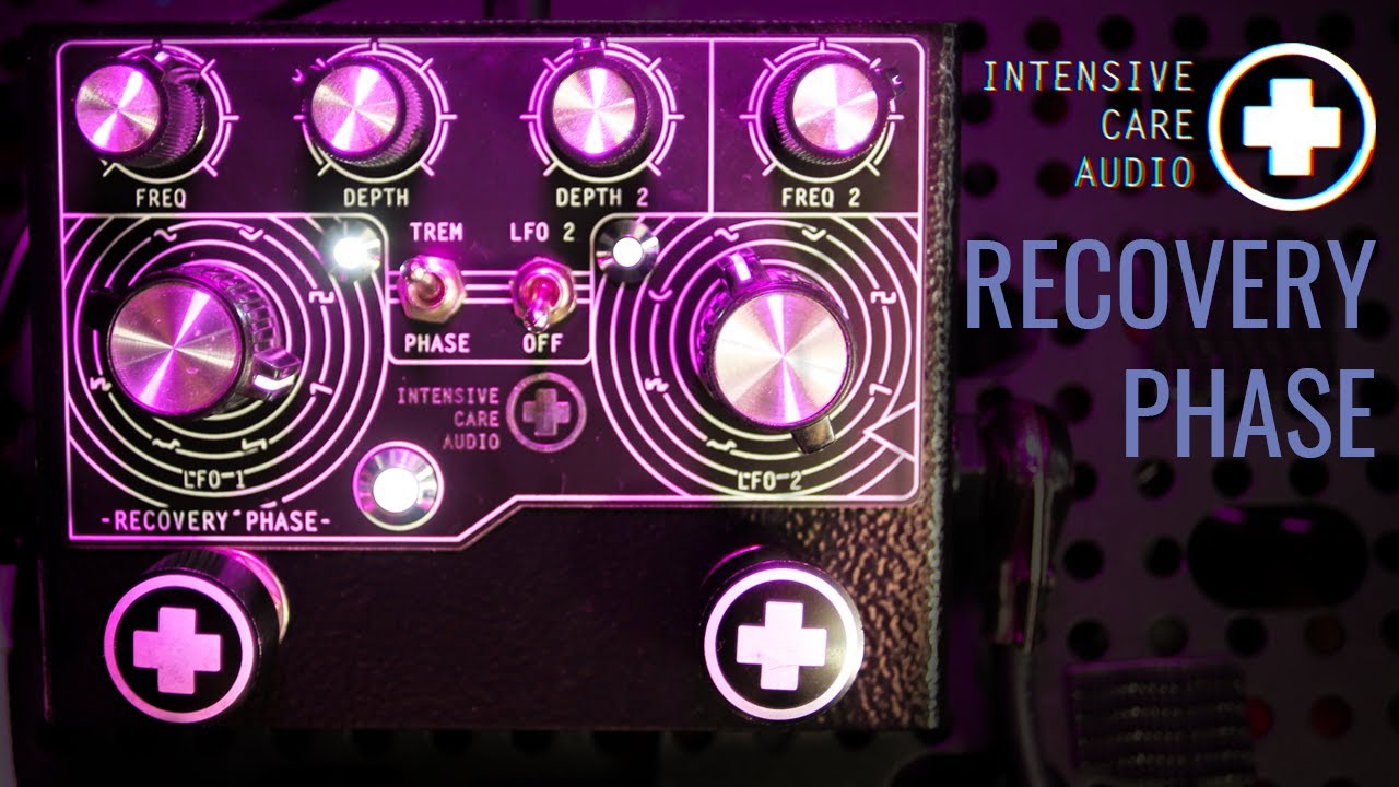 La Intensive Care Audio Recovery Phase est un double phaser. Dans le domaine, il y avait déjà eu le légendaire Mu-Tron Biphase dans les années 1970, mais la Recovery Phase propose des réglages encore plus fins et complets, pour des résultats hypnotisants. Chaque phaser dispose de ses propres réglages. Le premier a ses potards de forme d’onde (avec huit choix différents), de vitesse et de profondeur, tandis que le deuxième phaser présente les trois mêmes réglages en rajoutant un switch qui donne le choix entre phaser et tremolo et un autre switch LFO 2 qui permet de désactiver le deuxième phaser, ou bien de le combiner avec le premier phaser et un tremolo en plus, pour trois modulations simultanées.