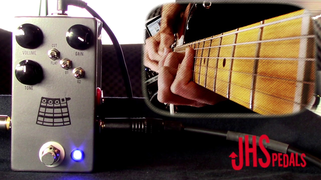 La pédale propose 3 réglages basiques de volume, tone et gain, associés à 3 switches. Les 2 premiers, G1 et G2, changent complètement le caractère de la pédale, allant de l'overdrive légère à la fuzz épaisse suivant la configuration. Le dernier switch cut/flat est un ajout de JHS, permettant de couper les basses fréquences pour mieux percer le mix.