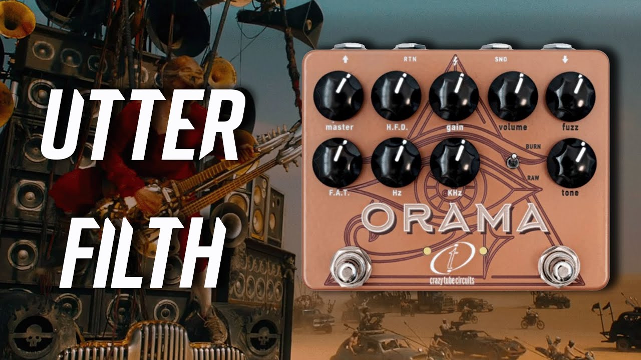 « Orama » signifie « vision » en grec. L’Orama incarne en effet la vision de la marque Crazy Tube Circuits des sons Rock, Hard Rock, Doom et Stoner. Pour générer ces sons légendaires qui ont forgé l’Histoire de la Musique amplifiée, la pédale rassemble deux circuits de saturation comme les Unobtanium, Hi-Power et Heetseaker de la marque. On a donc d’un côté, un circuit de type amp in a box articulé autour de transistors JFET et de l’autre un circuit de fuzz. Le circuit amp in a box génère les sons et les sensations de jeu du fameux Orange OR120, un ampli de légende utilisé par de très nombreux guitaristes, de Peter Green à Noel Gallagher en passant par Matt Pike. Pour une sonorité aussi présente et rugueuse que celle de l’ampli original, le circuit fonctionne à 34 Volts. Pour ajuster ce circuit, on dispose des mêmes réglages que sur l’OR120 : Gain, HZ (basse), KHz (aigus), F.A.T (Fatness Adjustment Tweak) et H.F.D (High Frequency Dynamics). Un réglage de Master vient compléter le tableau. Les réglages H.F.D et F.A.T sont directement repris de l’ampli original. H.F.D correspondant en effet au réglage H.F Drive de l’OR120, il ajoute de la définition, du mordant et de la clarté en boostant le gain des hautes harmoniques. F.A.T correspond au réglage F.A.C (Frequency Attenuation Control) de l’ampli original. Ce réglage cranté à cinq positions ajuste la quantité de basses et de bas-médiums injecté dans les étages de gain. Ce réglage ajoute de la lourdeur et du punch au son.