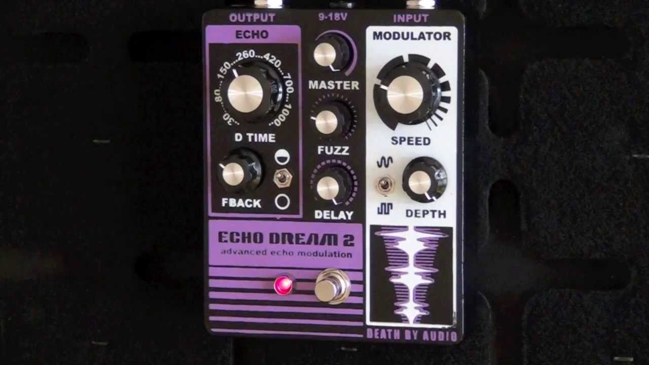Death by Audio, fabricant américain implanté à New-York, propose avec son Echo Dream 2, un délai à l’image de ses autres créations. Elle arbore un look très sexy avec des couleurs bien choisies et des visuels très attrayants. Ce délai un peu particulier est agrémenté d’une fuzz et d’un effet de modulation qui, une fois combinés, vous permettent de créer des paysages sonores très oniriques et planants. Pour contrôler le délai, on dispose de réglages de Time, Feedback et Delay. Le potard Time permet d’ajuster le temps du délai entre 30mS et 1000mS. Plus la valeur sera haute, plus on peut entendre des légers flutters, du bruit et de la saturation arriver. Pour la fuzz, on ne profite que d’un réglage de volume, baptisé ici Fuzz. Enfin, la section Modulator bénéficie de réglages de Speed et Depth en plus d’un switch pour alterner entre une forme d’onde sinusoïdale et une forme d’onde carrée.