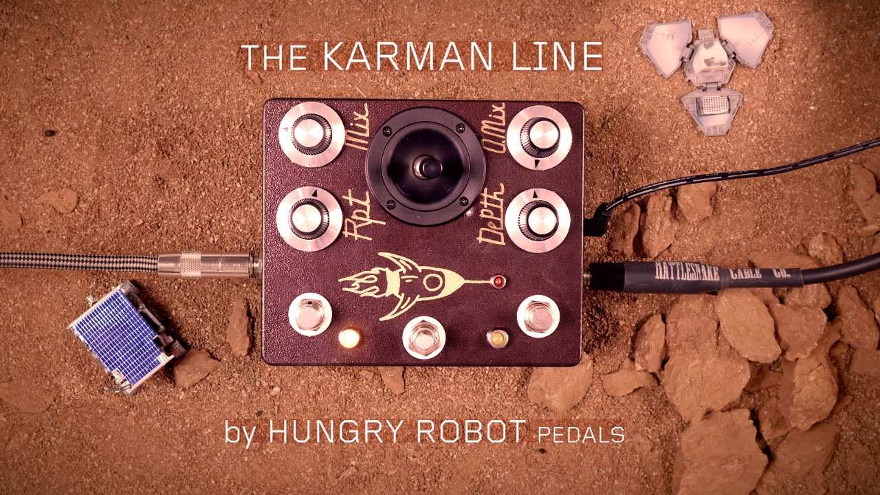 Au cœur de la Kármán Line se trouve une ligne de delay filtrée, caractérisée par des répétitions sombres et saturées. Ce delay lo-fi, inspiré du grain d’un vinyle, ajoute une modulation de hauteur imitant le son d’un tourne-disque ralenti manuellement. Cette modulation, générée par un LFO analogique basé sur la lumière, peut être ajustée de façon subtile ou poussée jusqu’à des effets extrêmes et chaotiques. L’élément le plus distinctif de la Kármán Line est, bien entendu, ce joystick de modulation. Ce dernier permet une manipulation du son guidée par l’instinct : l’axe Y ajuste le temps de delay, créant des artefacts sonores et l’axe X contrôle le taux de modulation, ouvrant ainsi un vaste champ d’expérimentations. Deux effets intégrés, « Swell » et « Launch », offrent différentes façons d’induire une oscillation progressive. Le footswitch « Swell » est un interrupteur momentané permettant une montée en intensité des répétitions, qui s’accumulent et s’amplifient avant de revenir à la normale une fois relâché. En parallèle, le footswitch « Launch » est un interrupteur à verrouillage qui génère une oscillation constante sous le mixage. Lorsque ce mode est activé, le joystick devient un puissant outil de manipulation sonore, et le bouton O.Mix permet de doser l’intensité de l’oscillation.