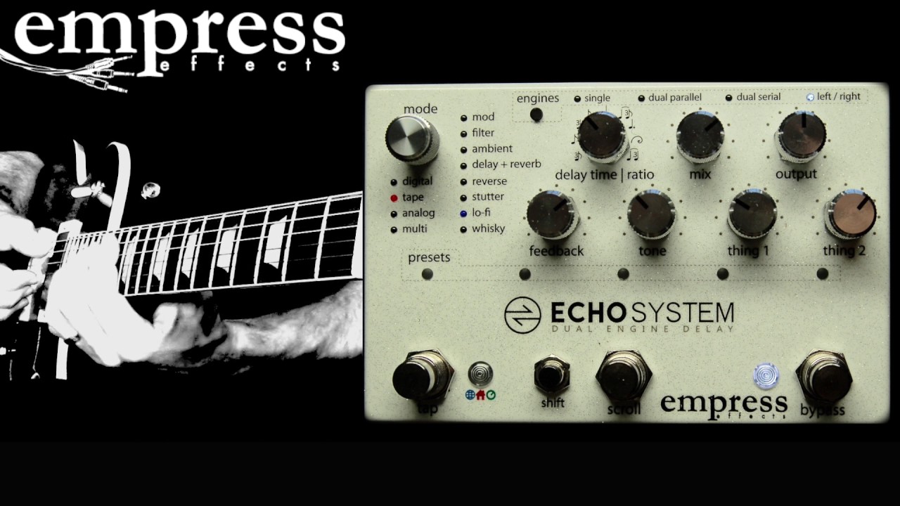 Couvrant toute la gamme de possibilités de delay connues et au-delà, l'Echosystem de Empress pourrait être l'outil de création ultime de delay. Les émulations fidèles des classiques tels que les délais numériques, à bande et analogiques sont nombreuses, ainsi que la version personnelle d'Empress sur chacun de ces styles d'effet. En allant au-delà du traditionnel, l'étendue des possibilités sonores de l'Echosystem devient évidente. Jetez un coup d'œil aux modes ambient lorsque vous vous sentez chill, ou allez voir les modes multi tap pour chercher de l'inspiration.