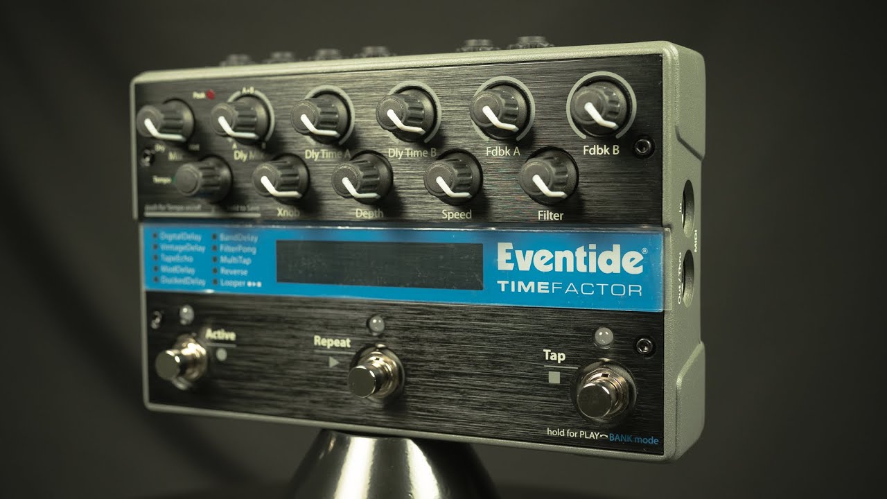 La TimeFactor d’Eventide est une pédale de délai. Elle intègre 2 délais différents labellisés A et B, qui disposent chacun de leurs réglages de Time et Feedback. Ils partagent le réglage Mix qui effectue la balance entre les signaux Dry et Wet. Un potard baptisé Delay Mix permet de mélanger les 2 délais à volonté. Le temps de chaque délai peut aller jusqu’à 3 secondes. On pourra appliquer un effet de modulation aux répétitions grâce aux potards Depth et Speed. Le réglage Filter permet d’égaliser rapidement les répétitions. Enfin, un potard dénommé XKnob ajuste un paramètre différent pour chaque algorithme.